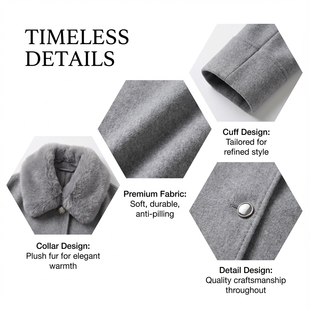 The fabric is so soft and feels wonderful against my skin. The fur collar and cuffs are incredibly fluffy and luxurious. It keeps me warm and cozy, and I always feel elegant when I wear it.