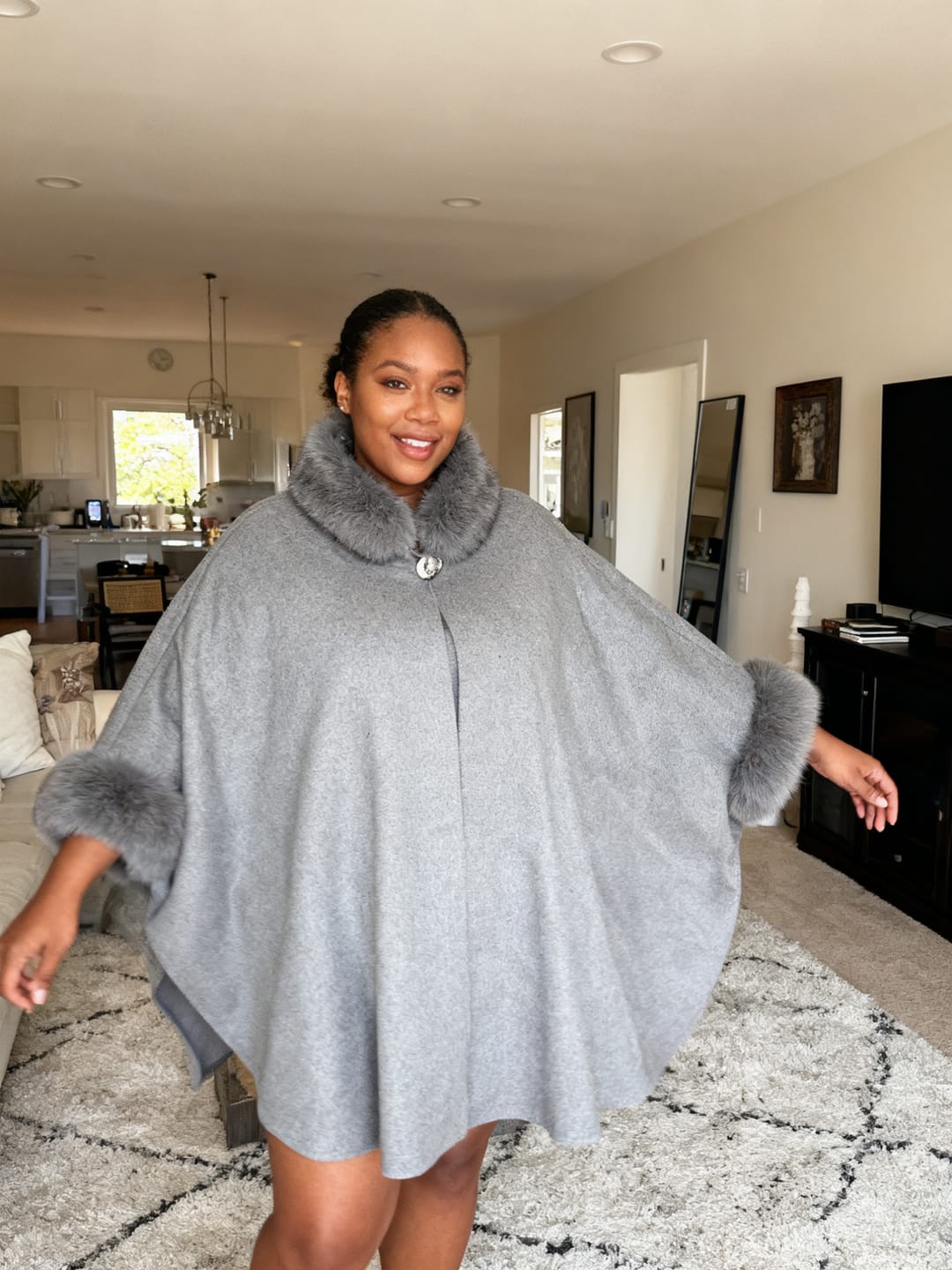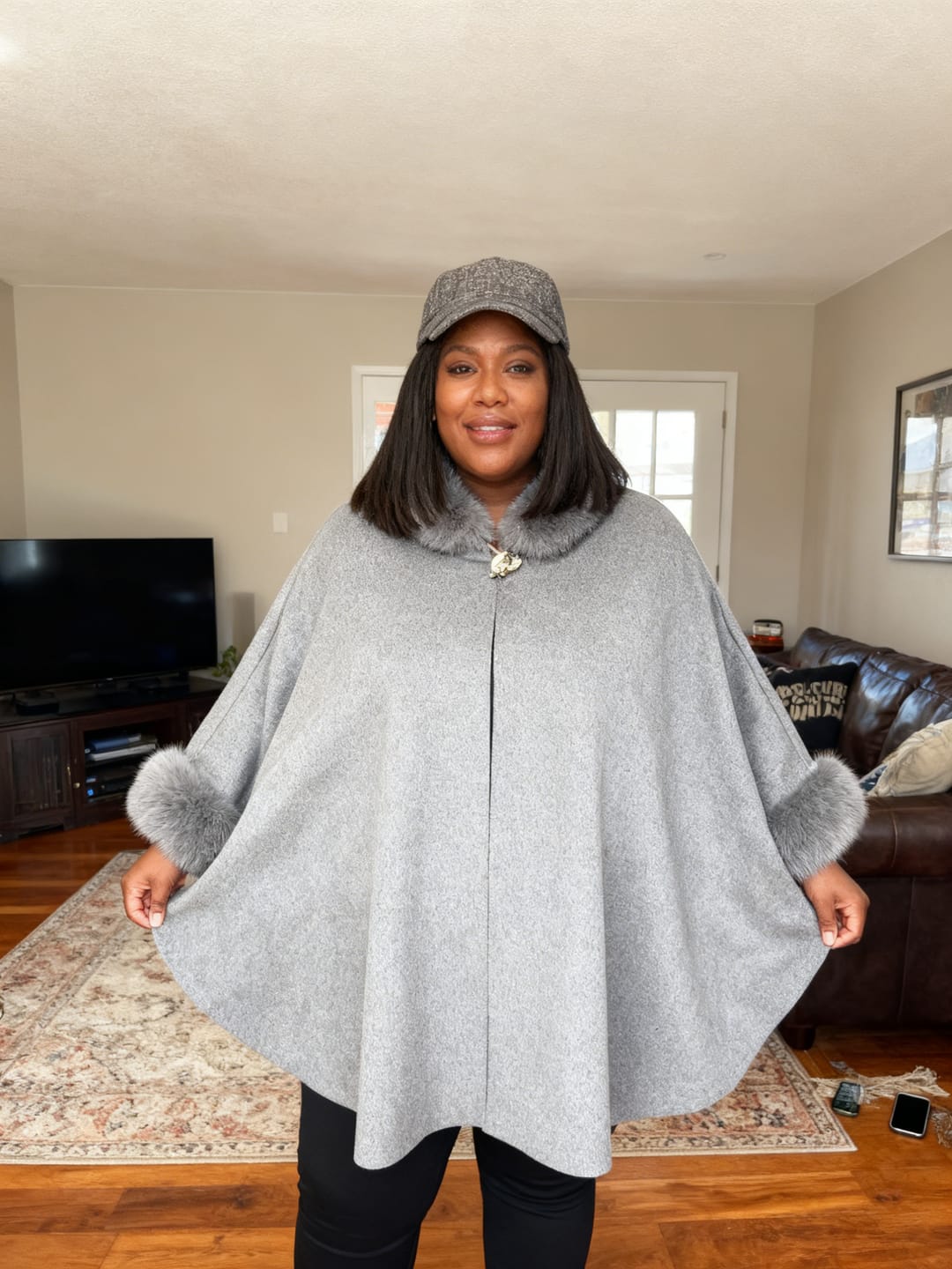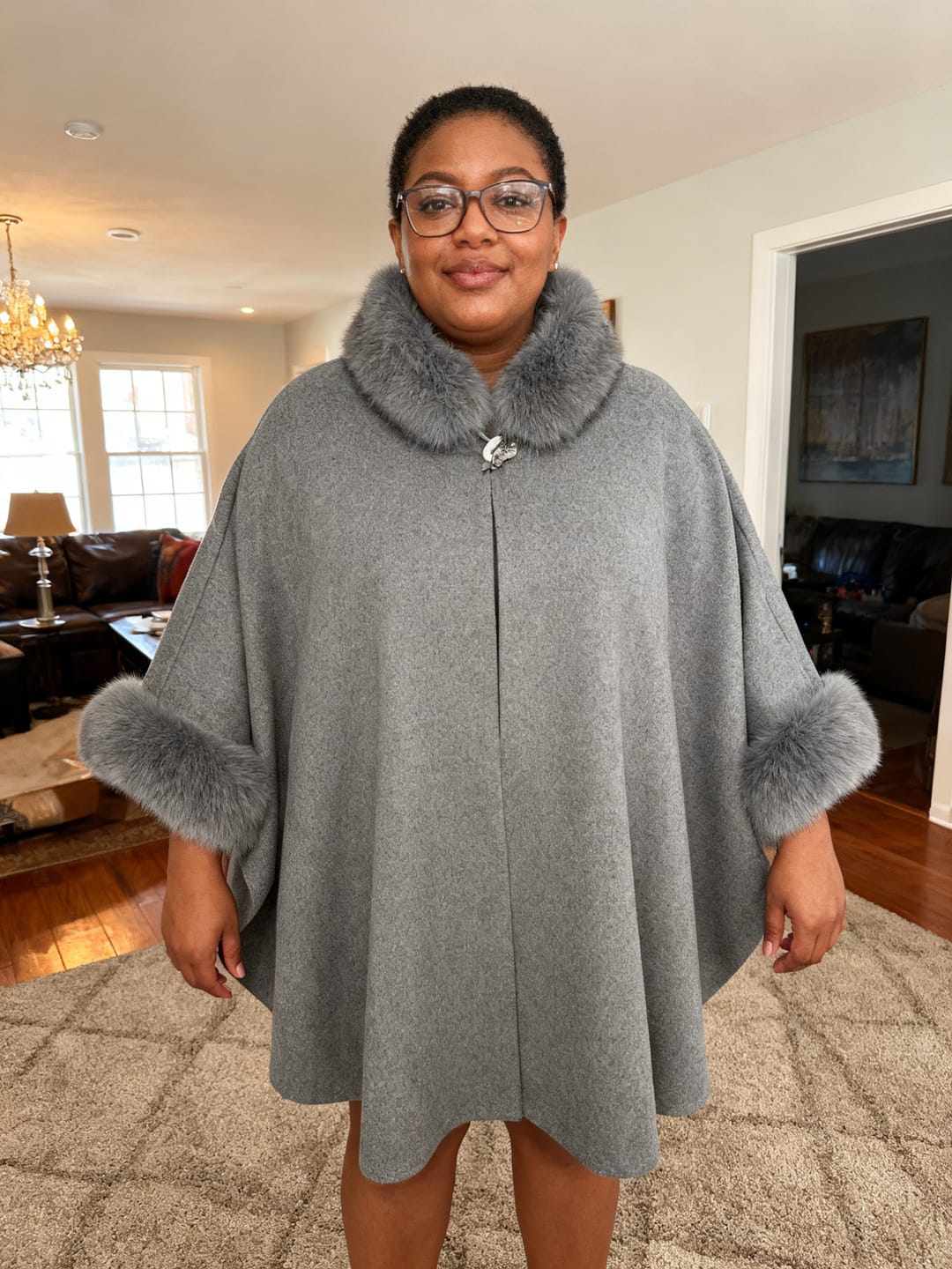 This classic wool cape brings together timeless style and all-day comfort. The plush fur collar adds elegance while keeping you warm. Tailored cuffs flatter your arms. High-quality fabric that won't pill or wear out. Pretty silver buttons give it that expensive look. Perfect for errands or meeting friends. Stay warm and look wonderful all season long.